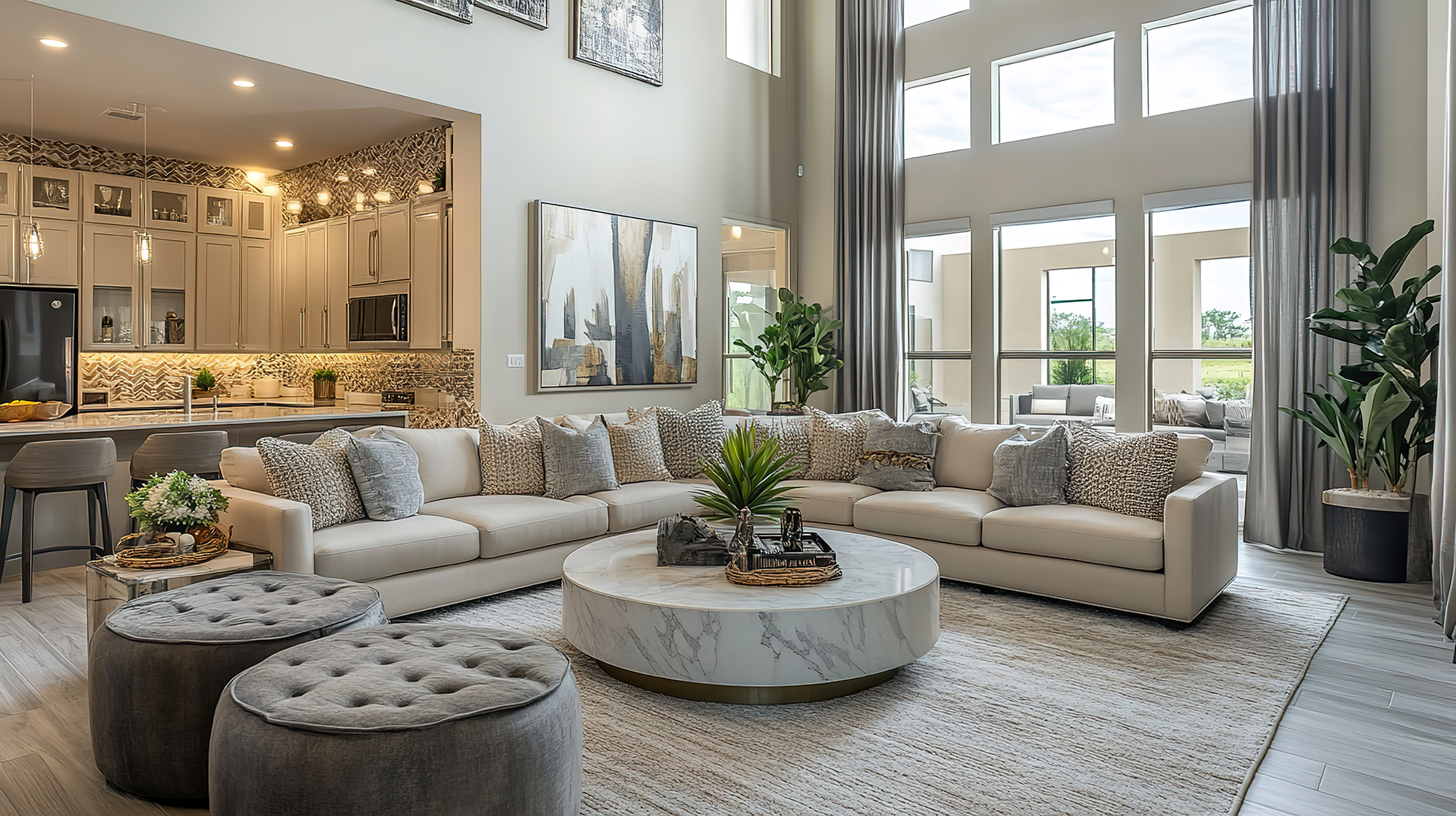 Elegant modern luxury living rooms embody a refined balance between sophistication and comfort. They are designed to impress with curated furniture, minimalist aesthetics, and rich material selections. Neutral color palettes dominate, while accent pieces in metallics or bold hues add a layer of glamour. The overall objective is to create a timeless environment that feels both luxurious and welcoming without appearing ostentatious.